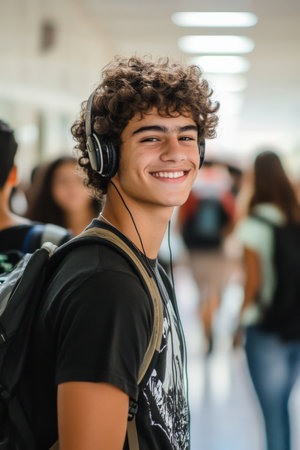 A Brazilian male high school student, with curly hair and a relaxed demeanor, is strolling through the school hallway. His headphones are on, and He is smiling softly, completely absorbed in his music, while other students pass by.