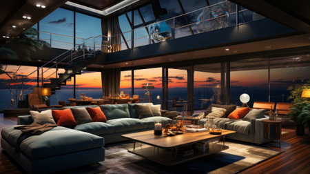 3d rendering of living room with sea view from terrace.