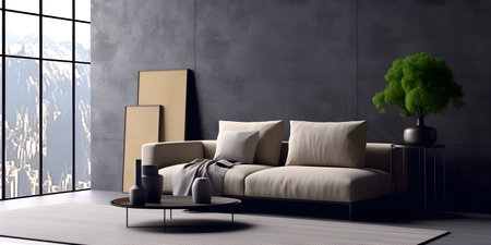 Interior home design. Minimalistic living room decoration. Dark color.