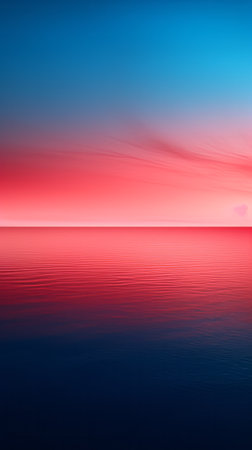 This image captures a tranquil scene of a sunset over a calm body of water. The sky transitions smoothly from deep blue at the top to warm hues of orange and pink near the horizon. The reflection of the sunset on the water creates a mirror-like effect, enhancing the peaceful ambiance of the scene.