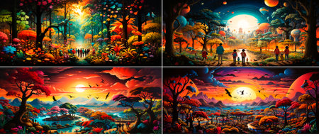 A stunning collection of sunset images showcasing silhouette trees, figures, and ocean views, emphasizing the beauty of nature at dusk. The vibrant colors blend harmoniously, creating an atmosphere of tranquility and solitude, ideal for travel and exploration themes.