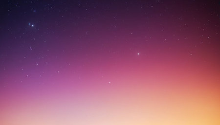 A vast expanse of deep purple transitioning to orange sky is filled with countless small white stars and a few...