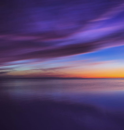 Stunning display of calm waters reflecting gradient skies at various times of day. The serene hues create a peaceful ambiance, perfect for relaxation or inspiration.