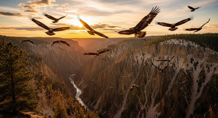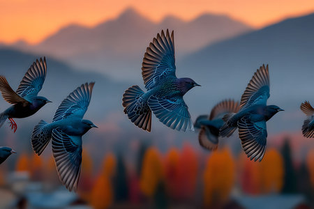 Starlings gracefully soar against a stunning sunset backdrop, with vibrant autumn trees and distant mountains creating a serene countryside setting. the vivid colors and dynamic composition capture the essence of nature's beauty and freedom. Generative AI