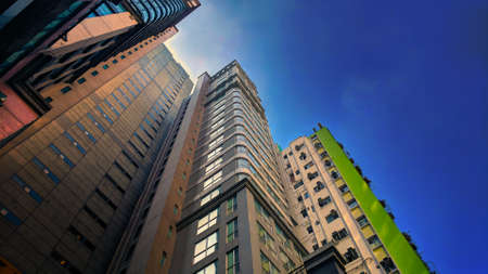 Bottom view of modern skyscrapers in business district against blue sky. Looking up at business buildings in downtown.