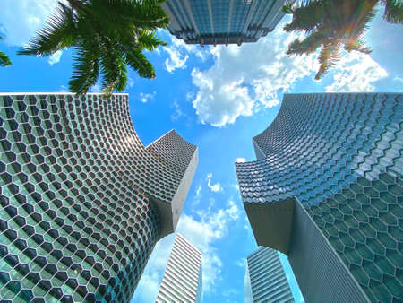 Looking up to skyscrapers and office buildings from below in metropolitan city