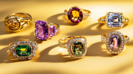 A stunning collection of colorful gemstone rings showcased on a soft yellow background, emphasizing intricate design and exquisite craftsmanship in jewelry.