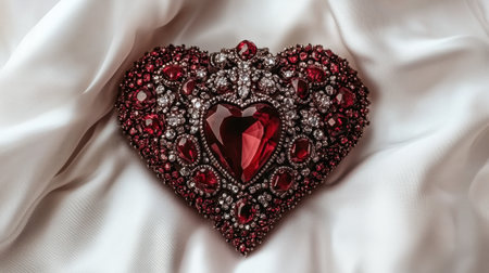 A beautifully crafted heart-shaped brooch featuring red and clear gemstones, resting elegantly on soft white satin fabric, perfect for adding a touch of luxury.