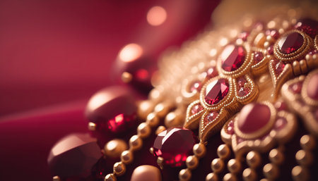 Beautiful abstract jewelery background with shiny red ruby gemstone. Horizontal background with copy space. AI generative image.