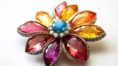 A stunning image showcasing a brooch adorned with vibrant gemstones set against colorful petals, perfect for highlighting luxury and elegance in jewelry design.