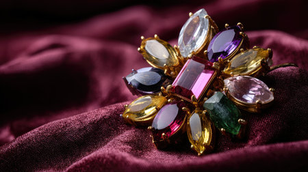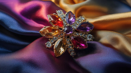 A stunning brooch featuring vibrant gemstones rests on a luxurious silk fabric. The intricate design and rich colors create an elegant composition.
