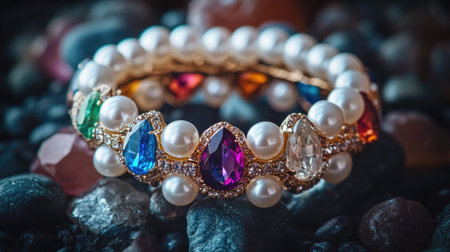 This captivating image features a stunning bracelet adorned with sparkling gemstones. The colorful reflections create a mesmerizing effect against the dark background, highlighting the intricate craftsmanship and luxurious appeal of the jewelry piece. Perfect for fashion and accessory blogs.