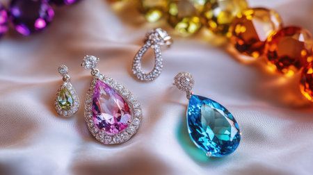Close-up view of exquisite jewelry featuring colorful gemstones on a soft silk fabric. Perfect for showcasing elegance and beauty in fashion.