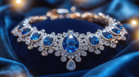 Diamond necklace with stunning blue stones, gracefully displayed on a soft velvet background, with selective focus on the central piece for a refined look