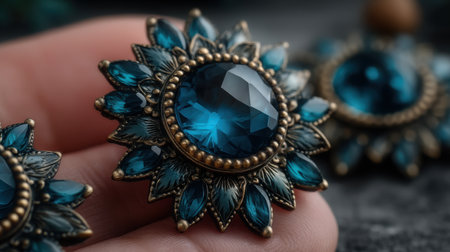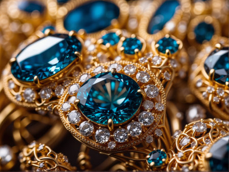 A stunning close-up of blue gemstone jewelry adorned with sparkling crystals, capturing the elegance and luxury of high-end accessories in intricate detail.