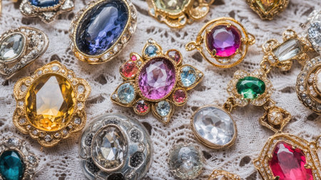 A detailed close-up of colorful vintage jewelry pieces displayed on a delicate lace background, showcasing their unique designs and sparkling gems.