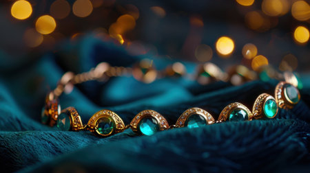 This stunning close-up image captures an elegant golden bracelet adorned with beautiful green gemstones, set against a soft bokeh background, emphasizing luxury.