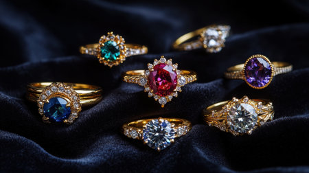 A stunning collection of colorful gemstone rings showcased on a black background, highlighting their vibrant hues and intricate designs. Perfect for luxury and fashion themes.