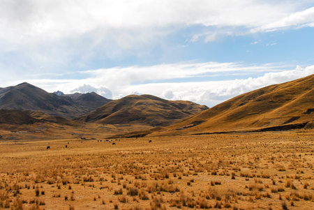 Road Cusco-Puno, Peru, South America. Sacred Valley of the Incas. Spectacular nature of mountains and blue sky.
