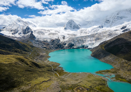 Aerial panorama of Cordillera Huayhuash Circuit andes mountain lake Laguna Carhuacocha Gangrajanca Ancash Peru