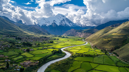 A Breathtaking landscape featuring lush green fields, winding river, and majestic snow capped mountains under dramatic sky. Nature beauty in serene valley