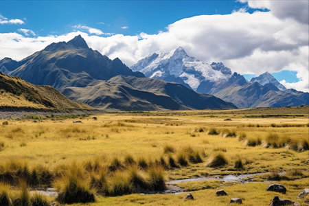 Awe-inspiring Afternoon Splendor: Enchanting Vista of Mountains, Meadow, and Sky in the Picturesque Chicarhuapunta, Huaylas Province, Ancash – Peru