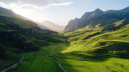 Majestic view of rice fields bathed in golden light within a mountainous terrain, showcasing the beauty of nature and agricultural life under a captivating sky.
