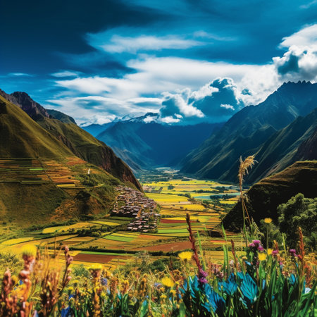 Experience the extraordinary journey through the captivating Sacred Valley and the majestic mountains of Cusco in this surreal and vibrant image. Explore a mystical landscape where ancient ruins intertwine with modern elements, unveiling the secrets of a bygone civilization. Immerse yourself in the rich history and breathtaking beauty of this captivating region, as soaring peaks and lush valleys transport you to hidden gems and breathtaking vistas. Let this visual masterpiece elicit awe and wonder, leaving viewers in awe of the wonders that await in Peru.