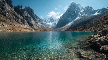 Majestic snow capped mountain peaks towering above a pristine glacial lake with the peaks perfectly reflected in the calm mirror like waters This breathtaking