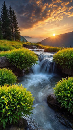 Beautiful mountain landscape with a small waterfall in the mountains at sunset