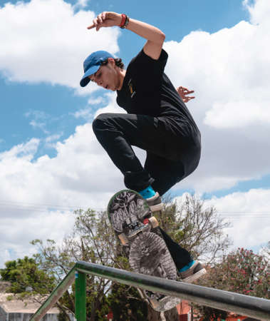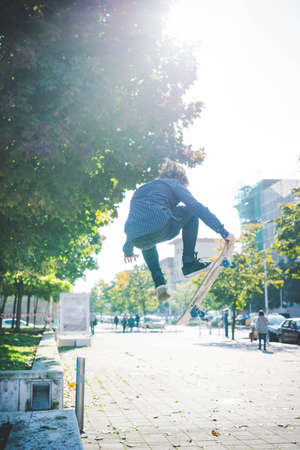 Young male skateboarder doing skateboarding jump on sidewalk