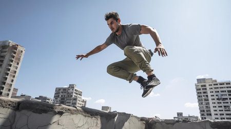 young man doing parkour jump in urban space in the city sunny spring summer day