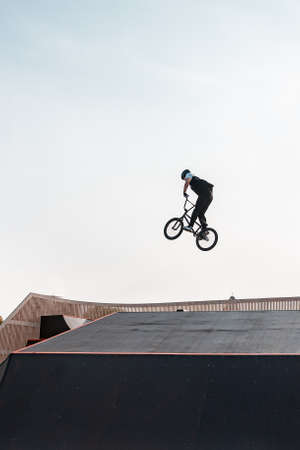 Kazan, Russia - September 26, 2020: A young rider on a BMX bike does tricks in the air. BMX freestyle in a skate park.