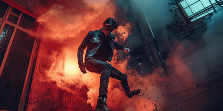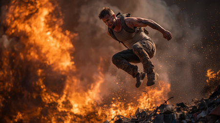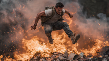 Tactical action hero leaps through explosion and burning wreckage in high-stakes blockbuster movie scene with intense fire, smoke, and dynamic motion.