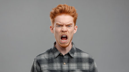 A striking portrait of a young man with fiery red hair passionately expressing anger and frustration. The intense expression captures raw emotion perfectly.