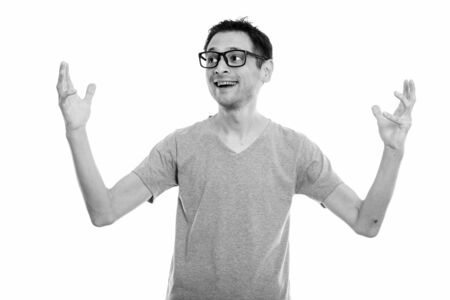 Studio shot of thoughtful happy young man smiling and wearing eyeglasses while giving speech