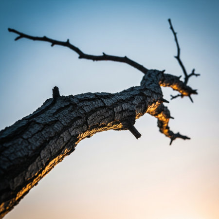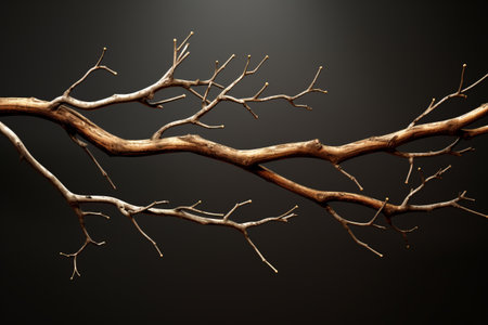 A single dry branch from a dead tree lies on a dark textured background, minimal lighting and sharp shadows for dramatic effect