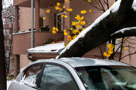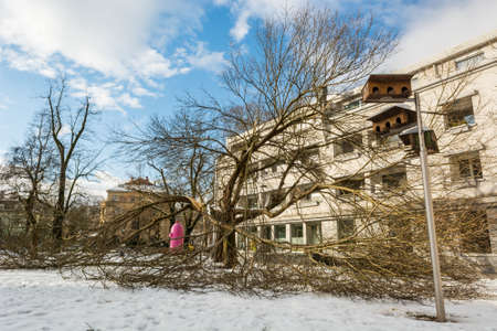 Snow calamity. Broken trees due to wet and heavy snow following a heavy snowfall in April.