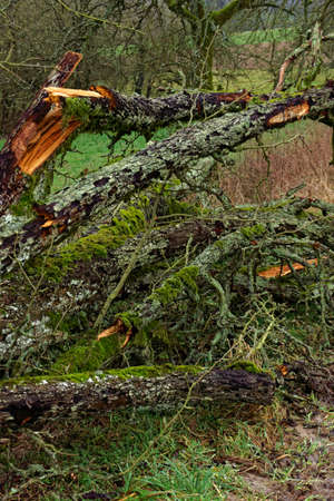 one tree trunk broken by strong winds and fallen to the ground