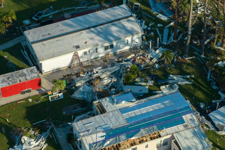 Severely damaged houses after hurricane Ian in Florida mobile home residential area. Consequences of natural disaster