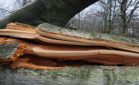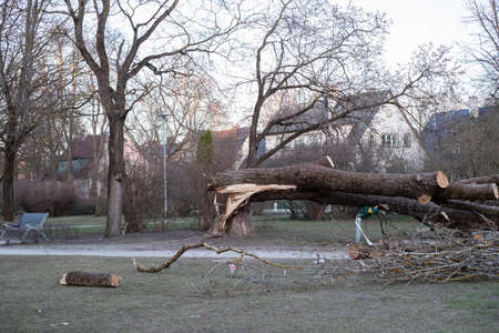 The remains of a fallen tree after a heavy storm in Berlin, Germany. The road is still closed because branches block the road.