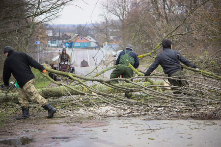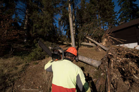 Worker cuts a fallen tree on the road