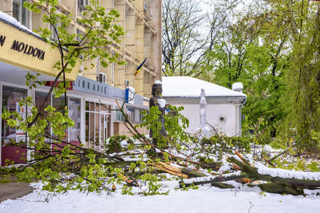 CHISINAU, MOLDOVA - APRIL 21, 2017: Heavy snow on frozen city, spring anomaly, natural cataclysm, falling green trees disaster, general emergency state, exceptional situation