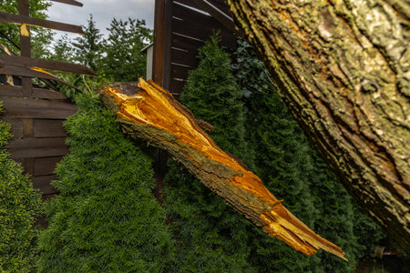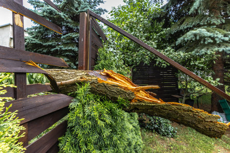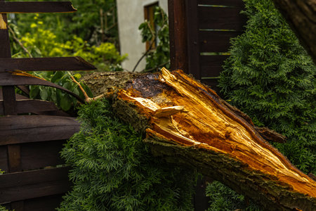 Broken fruit tree during a storm in the garden, lightning struck, ignited and broke a tree under the house, shattered fence, destroyed fence