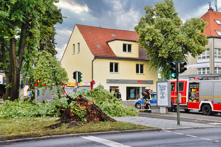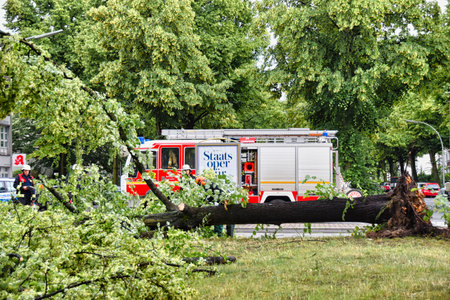 Berlin, Germany - June 12, 2019: An uprooted tree lying on a main street in Berlin, Germany, after a heavy storm. The police are blocking the road and firefighters are clearing away the branches.