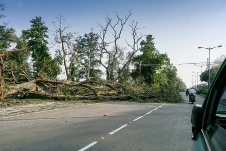 Kolkata, West Bengal, India - 23rd May 2020 : Super cyclone Amphan uprooted tree which fell and blocked road partially. The devastation has made many trees fall on ground. Cars passing through.