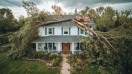 Fallen tree in front of a house after a violent storm.
