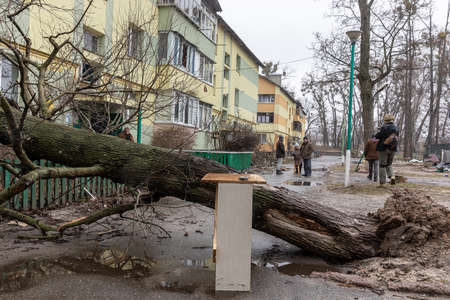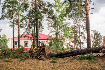 Trees damaged and uprooted after a violent storm. Trees have fallen in a residential village