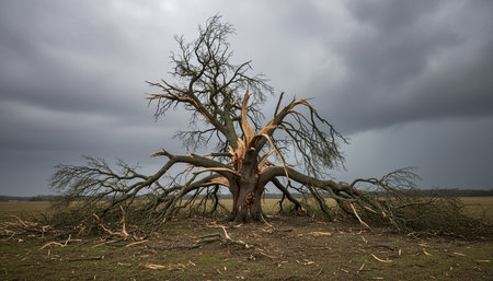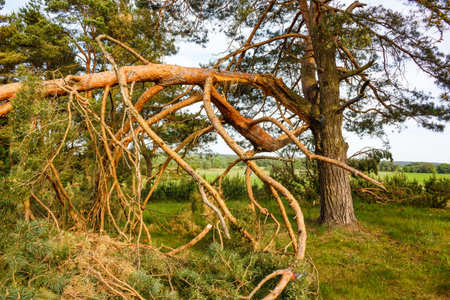 Vivid scene of a massive pine tree snapped and fallen, its intricate branches creating a messy tangle on the lush green ground. A powerful display of natural forces