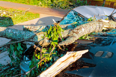Neighborhood storm damage aftermath. Tree crushes car.